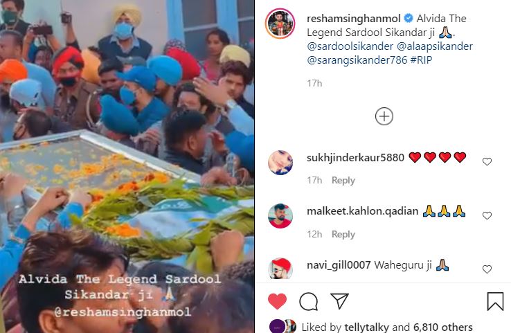 punjabi singers tribute to sardool sikander:ਸੁਰਾਂ ਦੇ ਸਿਕੰਦਰ ‘ਸਰਦੂਲ ਸਿਕੰਦਰ’ ਜੋ ਕਿ ਇਸ ਸੰਸਾਰ ਨੂੰ ਅਲਵਿਦਾ ਕਹਿ ਗਏ ਨੇ। ਉਨ੍ਹਾਂ ਦੀ ਮੌਤ ਦੀ ਖਬਰ ਨੇ ਹਰ ਇੱਕ ਝੰਜੋੜ ਕਰ ਰੱਖ ਦਿੱਤਾ ਹੈ। ਪੰਜਾਬੀ ਮਿਊਜ਼ਿਕ ਜਗਤ ਚ ਸੋਗ ਦੀ ਲਹਿਰ ਛਾਈ ਹੋਈ ਹੈ। ਪੰਜਾਬੀ ਗਾਇਕ ਰੇਸ਼ਮ ਸਿੰਘ ਅਨਮੋਲ ਨੇ ਭਾਵੁਕ ਵੀਡੀਓ ਆਪਣੇ ਇੰਸਟਾਗ੍ਰਾਮ ਅਕਾਉਂਟ ਉੱਤੇ ਸ਼ੇਅਰ ਕੀਤੀ ਹੈ ।ਰੇਸ਼ਮ ਸਿੰਘ ਅਨਮੋਲ ਨੇ ਮਰਹੂਮ ਗਾਇਕ ਸਰਦੂਲ ਸਿਕੰਦਰ ਦੀ ਅੰਤਿਮ ਯਾਤਰਾ ਦੀ ਵੀਡੀਓ ਸਾਂਝੀ ਕੀਤੀ ਹੈ । ਇਸ ਵੀਡੀਓ ‘ਚ ਦੇਖ ਸਕਦੇ ਹੋਏ ਉਨ੍ਹਾਂ ਨੂੰ ਕਿਸਾਨੀ ਝੰਡੇ ਦੇ ਨਾਲ ਲਪੇਟ ਕੇ ਸ਼ਰਾਂਜਲੀ ਦਿੱਤੀ ਗਈ ਹੈ ।ਕੈਪਸ਼ਨ ‘ਚ ਰੇਸ਼ਮ ਸਿੰਘ ਅਨਮੋਲ ਨੇ ਲਿਖਿਆ ਹੈ-‘ਅਲਵਿਦਾ ਲੈਜੇਂਡ ਸਰੂਦਲ ਸਿਕੰਦਰ ਜੀ’ । ਪ੍ਰਸ਼ੰਸਕ ਵੀ ਕਮੈਂਟ ਕਰਕੇ ਸੁਰਾਂ ਦੇ ਸਿਕੰਦਰ ਨੂੰ ਸ਼ਰਧਾਂਜਲੀ ਦੇ ਰਹੇ ਨੇ। ਵੱਡੀ ਗਿਣਤੀ ‘ਚ ਸਰੂਦਲ ਜੀ ਚਾਹੁਣ ਵਾਲੇ ਉਨ੍ਹਾਂ ਦੀ ਅੰਤਿਮ ਯਾਤਰਾ ‘ਚ ਸ਼ਾਮਿਲ ਹੋਏ ਸਨ।