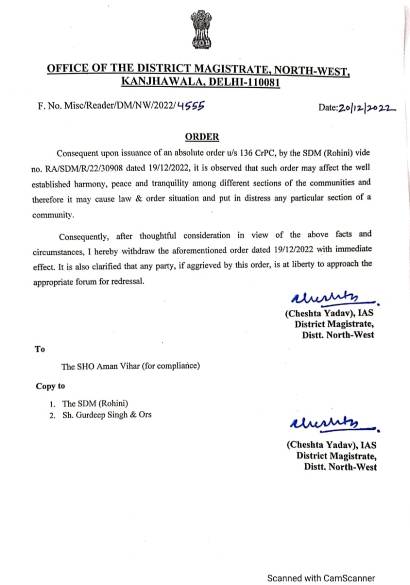 ਦਿੱਲੀ: ਸਿੱਖਾਂ ਲਈ ਗੁਰਦੁਆਰਾ ਸਾਹਿਬ 'ਚ ਨਤਮਸਤਕ ਹੋਣ ਬਾਰੇ ਵਿਵਾਦਤ ਹੁਕਮ ਹੋਇਆ ਵਾਪਸ Wednesday 21 December 2022 10:36 AM UTC+00 | Tags: delhi gurdwara-sahib gurdwara-sahib-rohini news rohini-in-delhi sikh the-district-magistrate-of-rohini ਚੰਡੀਗੜ੍ਹ 21 ਦਸੰਬਰ 2022: ਦਿੱਲੀ ਵਿਚ ਰੋਹਿਣੀ ਦੇ ਜ਼ਿਲ੍ਹਾ ਮੈਜਿਸਟ੍ਰੇਟ ਚੇਸ਼ਠਾ ਯਾਦਵ ਨੇ ਵੱਲੋਂ ਸਿੱਖਾਂ ਲਈ ਗੁਰਦੁਆਰਾ ਸਾਹਿਬ ਵਿਚ ਨਤਮਸਤਕ ਹੋਣ ਲਈ ਸਮਾਂ-ਸੀਮਾ ਨਿਸ਼ਚਿਤ ਕਰਨ ਦੇ ਜਾਰੀ ਵਿਵਾਦਤ ਹੁਕਮ ਵਾਪਸ ਲੈ ਗਏ ਹਨ।ਉਹਨਾਂ ਵੱਲੋਂ 20 ਦਸੰਬਰ ਨੂੰ ਜਾਰੀ ਹੁਕਮਾਂ ਵਿਚ ਕਿਹਾ ਗਿਆ ਕਿ ਐਸਡੀਐਮ ਰੋਹਿਣੀ ਵੱਲੋਂ ਜਾਰੀ ਹੁਕਮਾਂ ਬਾਰੇ ਇਹ ਵਿਚਾਰਿਆ ਗਿਆ ਹੈ ਕਿ ਇਸ ਨਾਲ ਵੱਖ ਵੱਖ ਫਿਰਕਿਆਂ ਵਿਚ ਬਣੀ ਆਪਸੀ ਸਾਂਝੀ ਪ੍ਰਭਾਵਿਤ ਹੋ ਸਕਦੀ ਹੈ ਤੇ ਅਮਨ ਕਾਨੂੰਨ ਵਿਵਸਥਾ ਖ਼ਤਰੇ ਵਿਚ ਪੈ ਸਕਦੀ ਹੈ, ਇਸ ਲਈ ਇਹ ਹੁਕਮ ਵਾਪਸ ਲਏ ਜਾਂਦੇ ਹਨ।