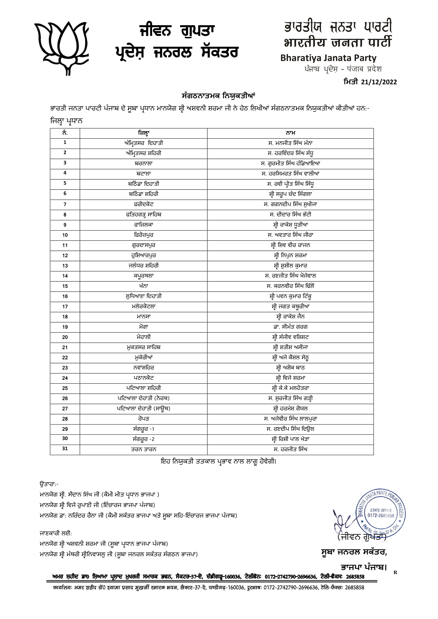 ਪੰਜਾਬ ਭਾਜਪਾ ਪ੍ਰਧਾਨ ਅਸ਼ਵਨੀ ਸ਼ਰਮਾ ਵਲੋਂ ਜ਼ਿਲ੍ਹਾ ਪ੍ਰਧਾਨਾਂ ਦੇ ਨਾਵਾਂ ਦਾ ਐਲਾਨ Wednesday 21 December 2022 11:54 AM UTC+00 | Tags: ashwani-kumar-sharma ashwani-sharma bjp-district-presidents news punjab punjab-bjp ਚੰਡੀਗੜ੍ਹ 21 ਦਸੰਬਰ 2022: ਭਾਰਤੀ ਜਨਤਾ ਪਾਰਟੀ ਪੰਜਾਬ (Bharatiya Janata Party Punjab) ਦੇ ਸੂਬਾ ਪ੍ਰਧਾਨ ਅਸ਼ਵਨੀ ਕੁਮਾਰ ਸ਼ਰਮਾ ਨੇ ਜ਼ਿਲ੍ਹਾ ਪ੍ਰਧਾਨਾਂ ਦੇ ਨਾਵਾਂ ਦਾ ਐਲਾਨ ਕਰ ਦਿੱਤਾ ਹੈ। ਇਸ ਸੰਬੰਧੀ ਸੂਚੀ ਹੇਠ ਅਨੁਸਾਰ ਹੈ |