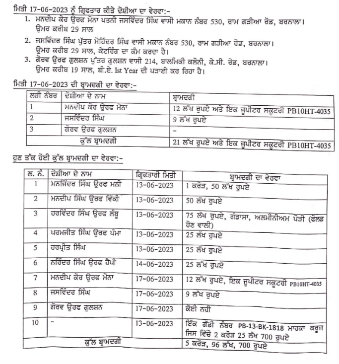 ਲੁਧਿਆਣਾ ਲੁੱਟ ਮਾਮਲਾ: ਪੁਲਿਸ ਨੇ ਡਾਕੂ ਹਸੀਨਾ ਪਤੀ ਸਮੇਤ ਉੱਤਰਾਖੰਡ ਤੋਂ ਗ੍ਰਿਫਤਾਰ Saturday 17 June 2023 04:21 PM UTC+00 | Tags: ludhiana-news ludhiana-police news ਲੁਧਿਆਣਾ, 17 ਜੂਨ 2023: ਮਨਦੀਪ ਸਿੰਘ ਸਿੱਧੂ, ਆਈ.ਪੀ.ਐਸ., ਕਮਿਸ਼ਨਰ ਪੁਲਿਸ, ਲੁਧਿਆਣਾ ਨੇ CMS ਲੁੱਟ ਕੇਸ, ਜਿਸ ਦੇ ਸਬੰਧ ਵਿੱਚ ਮੁਕੱਦਮਾ ਨੰਬਰ 81 ਮਿਤੀ 10-06-2023 ਅ/ਧ 395,342,323,506,427, 120-ਬੀ ਭ:ਦੰਡ ਅਤੇ 25-54-59 ਅਸਲਾ ਐਕਟ ਥਾਣਾ ਸਰਾਭਾ ਨਗਰ, ਲੁਧਿਆਣਾ ਦਰਜ ਹੈ | ਮਾਮਲੇ ਸਬੰਧੀ ਦੱਸਿਆ ਕਿ ਸੋਮਿਆ ਮਿਸ਼ਰਾ, ਆਈ.ਪੀ.ਐਸ, ਜੁਆਇੰਟ ਕਮਿਸ਼ਨਰ ਪੁਲਿਸ, ਸਿਟੀ, ਲੁਧਿਆਣਾ, ਹਰਮੀਤ ਸਿੰਘ ਹੁੰਦਲ, ਪੀ.ਪੀ.ਐਸ, ਡਿਪਟੀ ਕਮਿਸਨਰ ਪੁਲਿਸ, ਇੰਨਵੈਸਟੀਗੇਸ਼ਨ, ਲੁਧਿਆਣਾ, ਸੁਭਮ ਅਗਰਵਾਲ, ਆਈ.ਪੀ.ਐਸ., ਵਧੀਕ ਡਿਪਟੀ ਕਮਿਸ਼ਨਰ ਪੁਲਿਸ, ਜੋਨ-3, ਲੁਧਿਆਣਾ, ਸਮੀਰ ਵਰਮਾ, ਪੀ.ਪੀ.ਐਸ., ਵਧੀਕ ਡਿਪਟੀ ਕਮਿਸ਼ਨਰ ਪੁਲਿਸ, ਓਪਰੇਸ਼ਨ, ਲੁਧਿਆਣਾ, ਮਨਦੀਪ ਸਿੰਘ, ਪੀ.ਪੀ.ਐਸ., ਸਹਾਇਕ ਕਮਿਸ਼ਨਰ ਪੁਲਿਸ, ਪੱਛਮੀ, ਲੁਧਿਆਣਾ, ਇੰਸ: ਕੁਲਵੰਤ ਸਿੰਘ, ਇੰਚਾਰਜ ਸੀ.ਆਈ.ਏ.-1 ਲੁਧਿਆਣਾ, ਇੰਸ, ਬੇਅੰਤ ਜੁਨੇਜਾ, ਇੰਚਾਰਜ ਸੀ.ਆਈ.ਏ.-2, ਲੁਧਿਆਣਾ ਇੰਸ: ਅਵਤਾਰ ਸਿੰਘ, ਇੰਚਾਰਜ ਸੀ.ਆਈ.ਏ.-3 ਲੁਧਿਆਣਾ ਅਤੇ ਕਾਊਂਟਰ ਇੰਟਲੈਜੱਸ ਦੀ ਟੀਮ ਨੇ ਹੋਰ ਸਫਲਤਾ ਹਾਸਲ ਕਰਦੇ ਹੋਏ ਇਸ ਮੁੱਕਦਮਾ ਵਿੱਚ ਇਸ ਲੁੱਟ ਦੀ ਮਾਸਟਰ ਮਾਈਂਡ ਦੋਸ਼ਣ ਮਨਦੀਪ ਕੌਰ ਉਰਫ ਮੋਨਾ ਅਤੇ ਇਸਦੇ ਪਤੀ ਜਸਵਿੰਦਰ ਸਿੰਘ ਵਾਸੀਆਨ ਮਕਾਨ ਨੰਬਰ 530, ਰਾਮ ਗੁੜੀਆ ਰੋਡ, ਬਰਨਾਲਾ ਨੂੰ ਉਤਰਾਖੰਡ ਤੋ ਗ੍ਰਿਫਤਾਰ ਕੀਤਾ ਹੈ। ਜੋ ਦੋਸ਼ੀਆ ਦੀ ਪੁੱਛ-ਗਿੱਛ ਪਰ ਦੋਸ਼ਣ ਮਨਦੀਪ ਕੌਰ ਉਰਫ ਮੋਨਾ ਦੀ ਸਕੂਟਰੀ ਜੂਪੀਟਰ ਵਿੱਚੋ ਜੋ ਕਿ ਉਸਨੇ ਆਪਣੇ ਘਰਵਾਲੇ ਦੇ ਰਿਸ਼ਤੇਦਾਰ ਦੇ ਘਰ ਦਿੜਬੇ ਖੜੀ ਕੀਤੀ ਹੋਈ ਸੀ ਵਿਚੋਂ ਲੁੱਟੇ ਹੋਏ 12 ਲੱਖ ਰੁਪਏ ਅਤੇ ਜਸਵਿੰਦਰ ਸਿੰਘ ਦੇ ਬਰਨਾਲਾ ਵਿਖੇ ਘਰ ਤੋਂ ਲੁੱਟ ਦੇ 9 ਲੱਖ ਰੁਪਏ ਬ੍ਰਾਮਦ ਕੀਤੇ ਹਨ। ਇਸ ਤੋਂ ਇਲਾਵਾ ਇਸ ਮੁੱਕਦਮਾ ਵਿੱਚ ਇਕ ਹੋਰ ਦੋਸ਼ੀ ਗੋਰਵ ਉਰਫ ਗੁਲਸ਼ਨ ਪੁੱਤਰ ਗੁਲਸ਼ਨ ਵਾਸੀ 214, ਬਾਲਮਿਕੀ ਕਲੋਨੀ, ਕੇ.ਸੀ. ਰੋਡ, ਬਰਨਾਲਾ ਨੂੰ ਗਿਦੜਬਾਹਾ, ਜ਼ਿਲ੍ਹਾ ਮੁਕਤਸਰ ਤੋ ਮਿਤੀ 17-06-2023 ਨੂੰ ਗ੍ਰਿਫਤਾਰ ਕੀਤਾ ਗਿਆ ਹੈ। ਜਿਸਨੇ ਪੁੱਛ-ਗਿੱਛ ਦੌਰਾਨ ਮੰਨਿਆ ਕਿ ਵਾਰਦਾਤ ਵਾਲੇ ਦਿਨ ਸੁਭਾ ਗੋਪਾ ਕਾਲੀ ਸ਼ੈਵਰਲੇ ਕਰੂਜ ਗੱਡੀ ਲੈ ਕਰ ਉਸਦੇ ਘਰ ਬਰਨਾਲਾ ਆਇਆ ਅਤੇ ਇਹ ਦੋਨੋ ਦੋਸ਼ੀਆਨ ਅਰੂਣ ਕੋਚ ਅਤੇ ਨੰਨੀ ਨੂੰ ਲੁਧਿਆਣਾ ਲੈਣ ਲਈ ਉੱਕਤ ਗੱਡੀ ਵਿੱਚ ਬੱਸ ਸਟੈਂਡ ਗਏ ਅਤੇ ਲੁੱਟੇ ਹੋਏ ਕੈਸ਼ ਸਮੇਤ ਉੱਕਤ ਦੋਸ਼ੀਆਨ ਨੂੰ ਲੈ ਕਰ ਵਾਪਸ ਬਰਨਾਲਾ ਆ ਗਏ। ਗ੍ਰਿਫਤਾਰ ਦੋਸ਼ੀਆ ਪਾਸੋ ਡੂੰਘਾਈ ਨਾਲ ਪੁੱਛ-ਗਿੱਛ ਜਾਰੀ ਹੈ।
