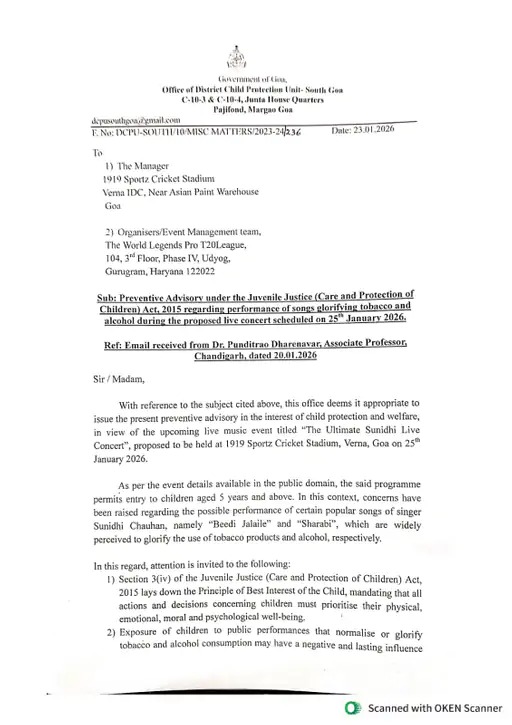 ਦੱਸ ਦੇਈਏ ਕਿ ਗਾਇਕਾ ਦਾ ਕੱਲ੍ਹ ਯਾਨੀ 25 ਜਨਵਰੀ ਨੂੰ ਗੋਆ ਦੇ 1919 ਸਪੋਰਟਸ ਕ੍ਰਿਕਟ ਸਟੇਡੀਅਮ ਵਿਚ ‘ਦਿ ਅਲਟੀਮੇਟ ਸੁਨਿਧੀ ਲਾਈਵ’ ਕੰਸਰਟ ਹੈ। ਇਸ ਨੂੰ ਲੈ ਕੇ ਡਾ. ਪੰਡਿਤ ਰਾਓ ਨੇ ਸਿਕਾਇਤ ਕੀਤੀ ਸੀ, ਜਿਸ ਵਿਚ ਆਯੋਜਕਾਂ ਨੂੰ ਬੱਚਿਆਂ ਦੀ ਮੌਜੂਦਗੀ ਵਿਚ ਤੰਬਾਕੂ ਤੇ ਸ਼ਰਾਬ ਨੂੰ ਬੜ੍ਹਾਵਾ ਦੇਣ ਵਾਲੇ ਗਾਣੇ ਨਾ ਵਜਾਉਣ ਤੇ ਨਾ ਗਾਉਣ ਦੇਣ ਦੀ ਪ੍ਰੀਵੈਂਟਿਵ ਐਡਵਾਈਜਰੀ ਕਰਨ ਦੀ ਮੰਗ ਕੀਤੀ ਸੀ। ਇਸੇ ਸ਼ਿਕਾਇਤ ਮਗਰੋਂ ਗੋਆ ਚਾਈਲਡ ਕਮਿਸ਼ਨ ਨੇ ਗਾਇਕਾ ਸੁਨਿਧੀ ਚੌਹਾਨ ਦੇ ਲਾਈਵ ਕੰਸਰਟ ਨੂੰ ਲੈ ਕੇ ਸਖਤ ਰੁਖ਼ ਅਪਣਾਇਆ ਹੈ। ਦੱਖਣ ਗੋਆ ਜ਼ਿਲ੍ਹਾ ਬਾਲ ਕਮਿਸਨ ਨੇ ਆਯੋਜਕਾਂ ਨੂੰ ਐਡਵਾਈਜਰੀ ਜਾਰੀ ਕਰਕੇ ‘ਬੀੜੀ ਜਲਾਈ ਲੇ’ ਵਰਗੇ ਗੀਤ ਨਾ ਗਾਉਣ ਲਈ ਕਿਹਾ ਗਿਆ ਹੈ।